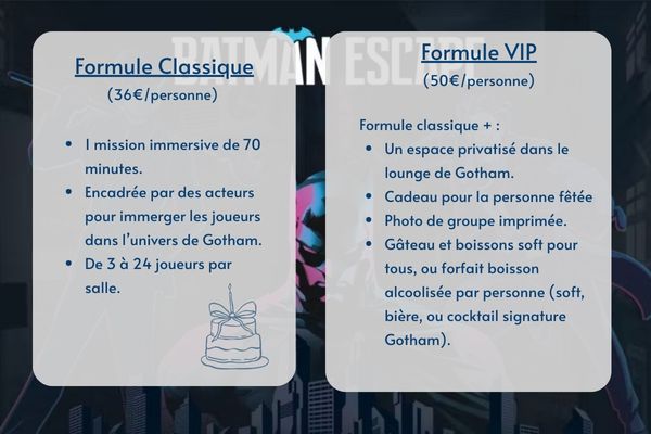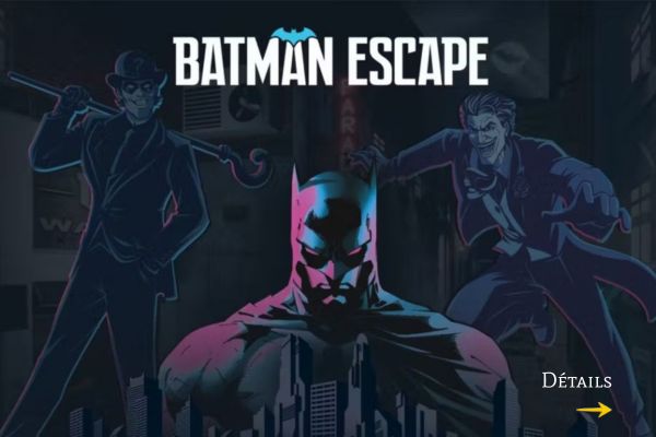 L’escape game Batman escape, celle du Joker est parfaitement adaptée aux enfants dès 7 ans : une aventure ludique, dynamique et accessible, où les jeunes héros devront résoudre des énigmes et affronter les pièges du plus célèbre des vilains. Rires, frissons et fierté d’avoir mené l’enquête seront au rendez-vous !
