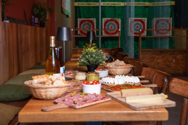 Les Cognées proposent un concept de loisir indoor réparti en trois espaces : un bar avec des tables pour boire un verre et patienter, les stands de lancer de hache, et une zone dédiée au tir à l’arc.